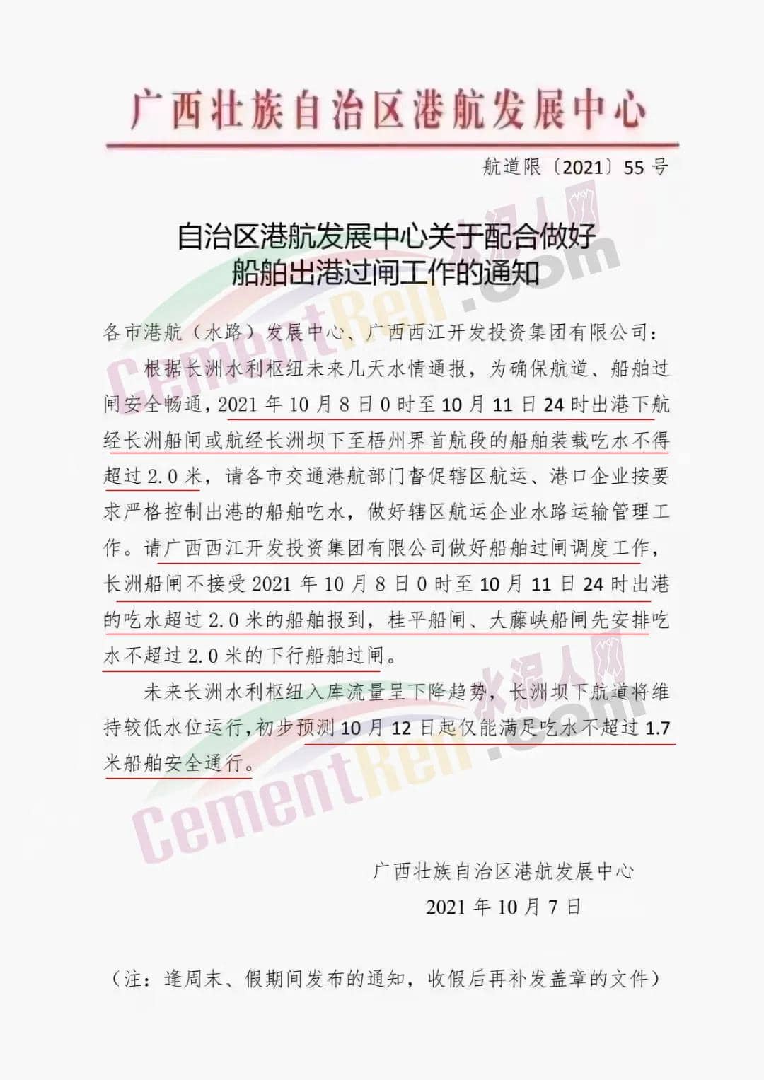 請廣西西江開發(fā)投資集團(tuán)有限公司做好船舶過閘調(diào)度工作,長洲船閘不接受2021年10月8日0時(shí)至10月11日24時(shí)出港的吃水超過2.0米的船舶報(bào)到,桂平船閘、大藤峽船閘先安排吃水不超過2.0米的下行船舶過閘。