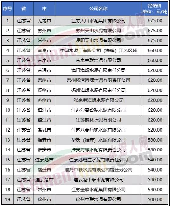 江蘇省部分企業(yè)PO42.5散裝水泥參考報(bào)價(jià)