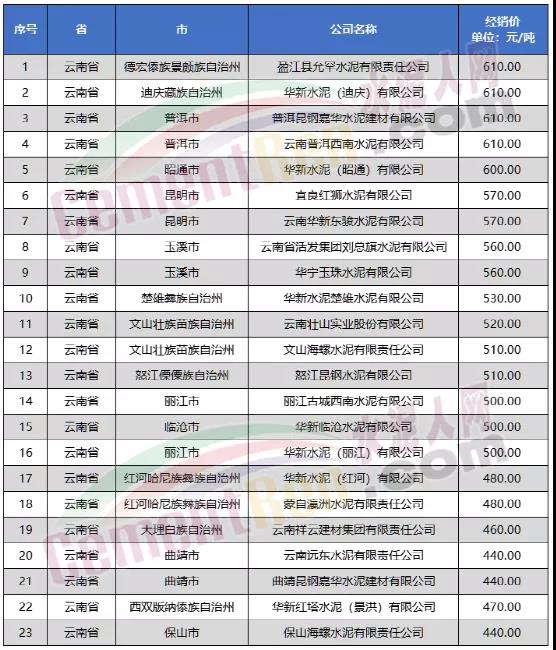 云南省部分企業(yè)PO42.5散裝水泥參考報(bào)價(jià)