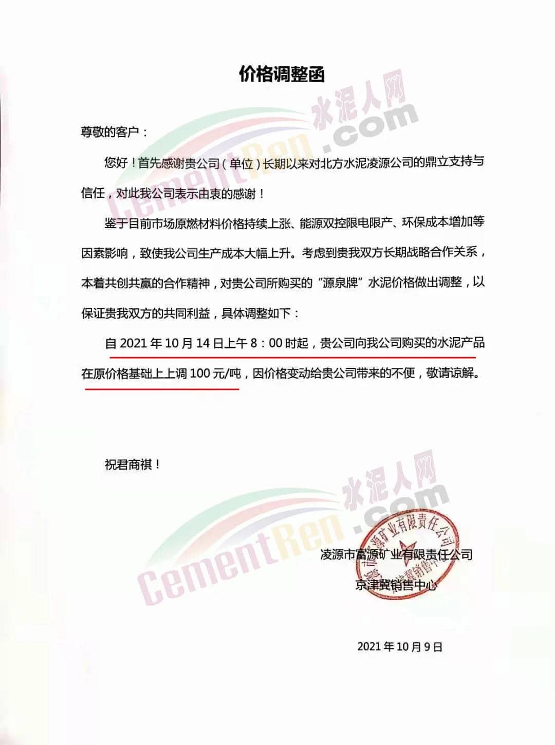 遼寧朝陽凌源市富源礦業有限責任公司京津冀銷售中心通知鑒于目前市場原燃材料價格持續上漲、能源雙控限電限產、環保成本增加等因素影響,致使公司生產成本大幅上升。自2021年10月14日上午8時起公司"源泉牌"水泥價格在原價格基礎上上調100元/噸。