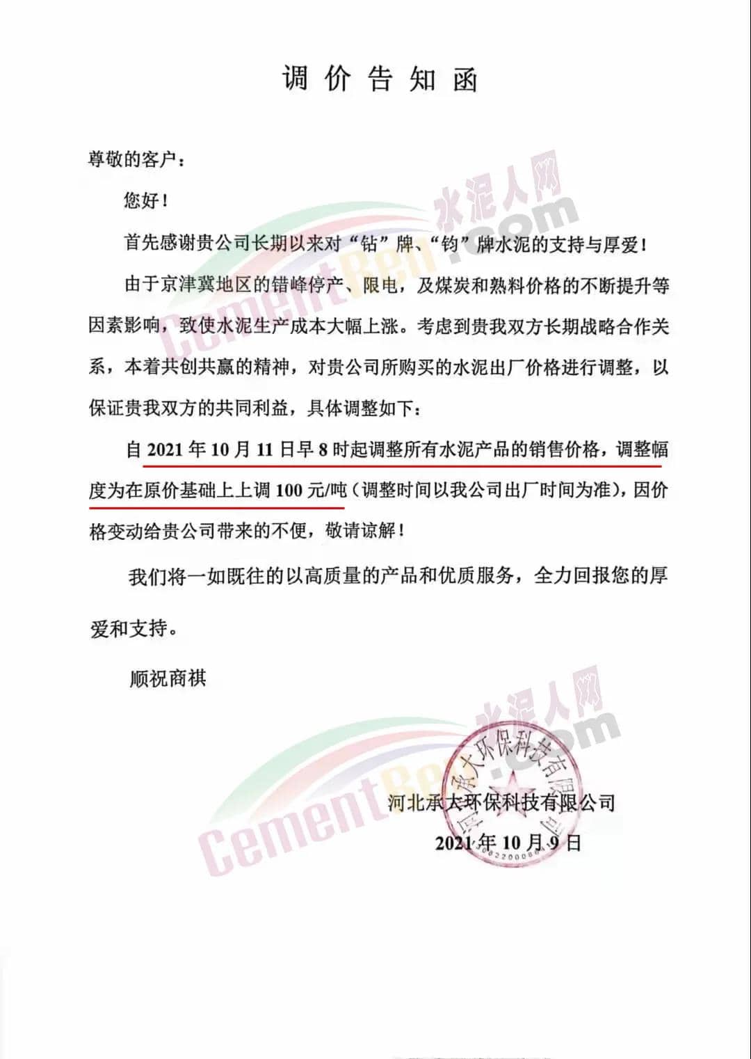 河北承大環保科技有限公司通知,由于京津冀地區的錯峰停產、限電,及煤炭和熟料價格的不斷提升等因素影響,致使水泥生產成本大幅上漲,自2021年10月11日早8時起所有水泥產品銷售價格在原價基礎上上調100元/噸。