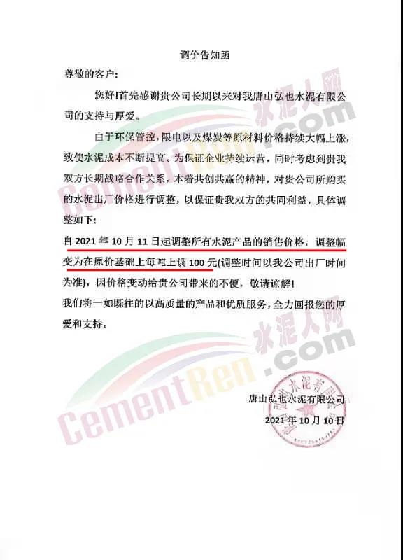 唐山弘也水泥有限公司通知,由于環保管控,限電以及煤炭等原材料價格持續大幅上漲,致使水泥成本不斷提高。為保證企業持續運營,自2021年10月11日起調整所有水泥產品的銷售價格在原價基礎上上調100元/噸。