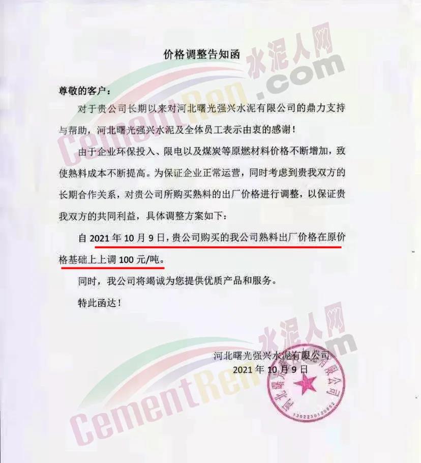 河北曙光強興水泥有限公司通知,由于企業環保投入、限電以及煤炭等原燃材料價格不斷增加,致使熟料成本不斷提高。為保證企業正常運營,自2021年10月9日,公司熟料出廠價格在原價格基礎上上調100元/噸。