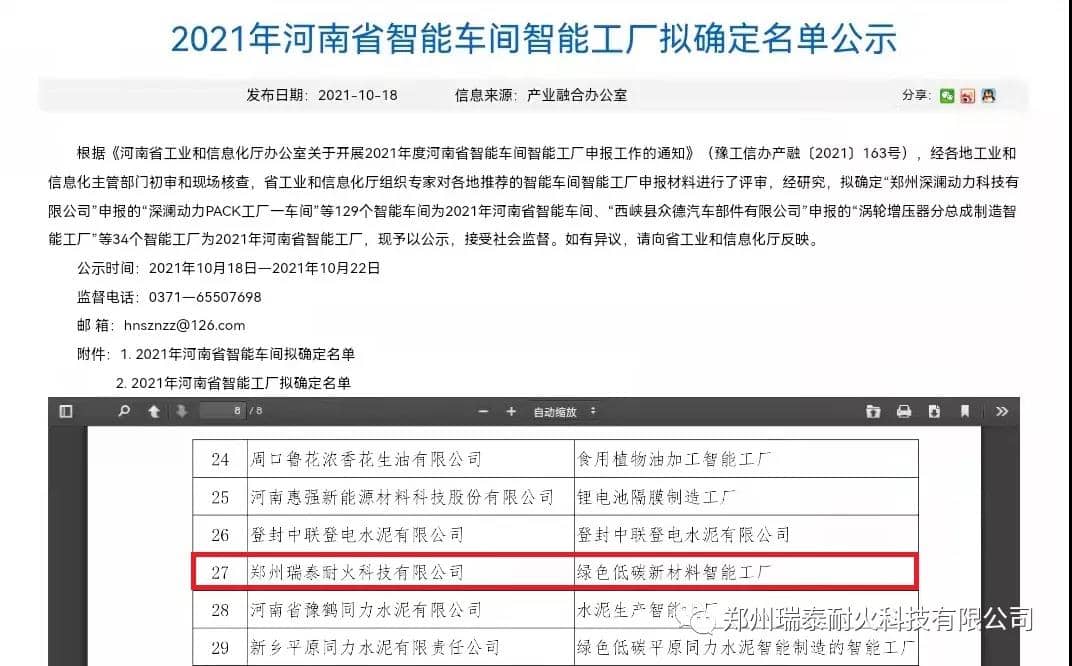 10月18日,河南省工業和信息化廳發布了2021年河南省“智能工廠”評審結果名單,鄭州瑞泰耐火科技有限公司通過認定,標志著鄭州瑞泰智能生產制造邁上了新臺階,實現了新突破。