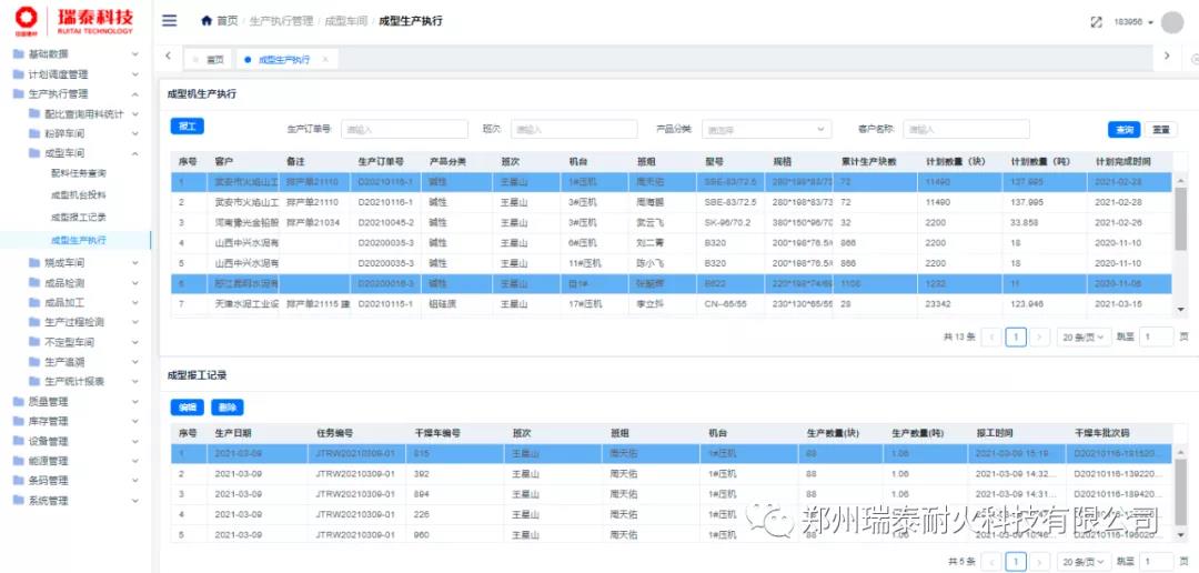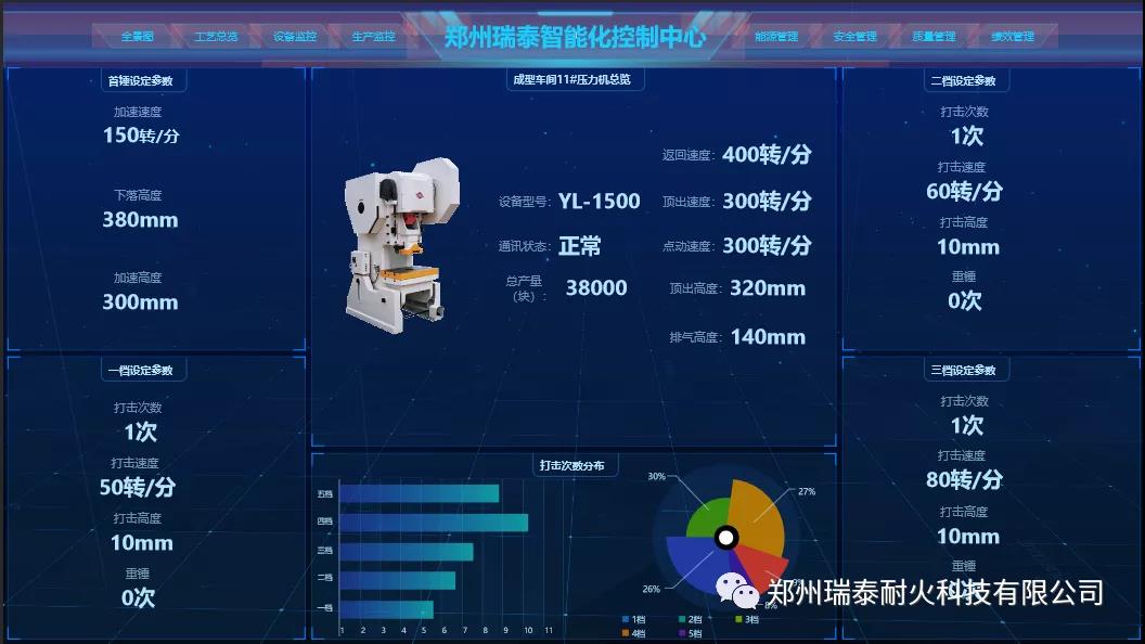 目前,鄭州瑞泰實現了耐火材料制造過程中的全部數字化管理與控制,包括生產計劃、作業派工、庫存等管理以及設備聯網、數據自動實時采集、工業大數據分析和現場看板化展示等。在生產過程中,從粉碎、配料、成型、燒成、檢測、包裝流程全面實現自動化、數字化、網絡化、智能化。