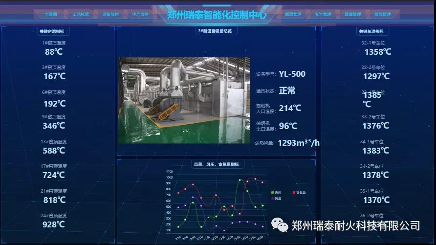 鄭州瑞泰在生產系統中采用MES系統,并實現與ERP、DCS、PLC等系統的集成運行。采用條碼管理系統,通過在PLM系統中使用,實現對產品全生命周期質量實時追溯。通過上線質量管理系統,產品質量信息可在線自動檢測、自動記錄。集控系統提供隧道窯、環保設備各項指標實時監測管理,具有數據采集、顯示、存儲、統計報表、打印、告警等功能。建立管控一體的中央控制室,主要用能設備實現實時監測與控制。創建軟硬件安全運行環境,確保網絡安全應急響應、實時恢復及安全可控。