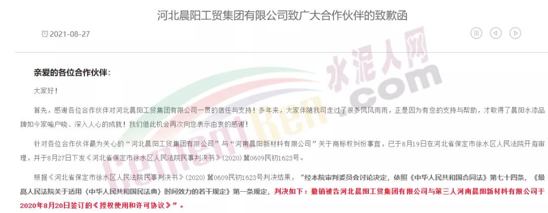 而在此之前,晨陽工貿集團發(fā)布消息稱:針對各位合作伙伴最為關心的“河北晨陽工貿集團有限公司”與“河南晨陽新材料有限公司”關于商標權糾紛事宜,河北省保定市徐水區(qū)人民法院于近日開庭審理,并下發(fā)《河北省保定市徐水區(qū)人民法院民事判決書》(2020)冀0609民初1623號。