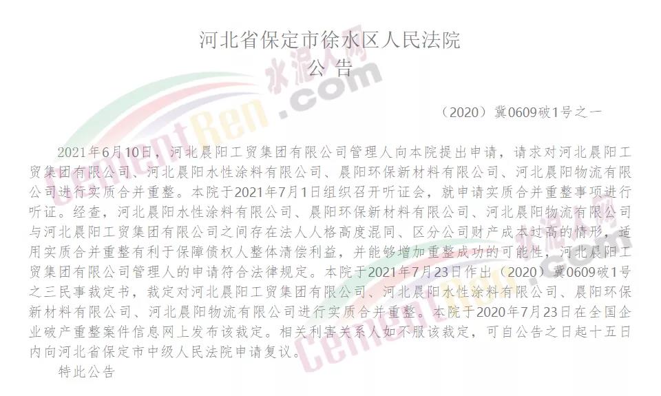 2021年6月10日,河北晨陽工貿集團有限公司管理人向徐水區(qū)人民法院提出申請,請求對河北晨陽工貿集團有限公司、河北晨陽水性涂料有限公司、晨陽環(huán)保新材料有限公司、河北晨陽物流有限公司進行實質合并重整。經(jīng)過一個多月的論證評估,于2021年7月23日作出(2020)冀0609破1號之三民事裁定,對河北晨陽工貿集團有限公司、河北晨陽水性涂料有限公司、晨陽環(huán)保新材料有限公司、河北晨陽物流有限公司進行實質合并重整。