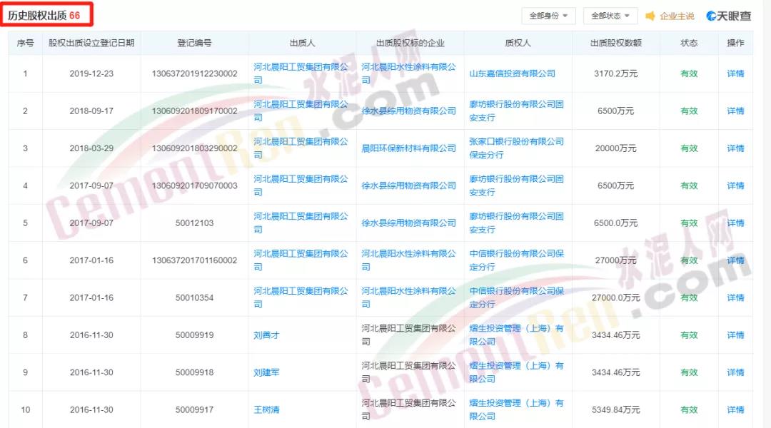 另據(jù)水泥人網(wǎng)了解,自2012年以來,在10年時間里,晨陽股權出質高達66次,涉及金額達上百億。進行土地抵押9次,涉及金額8273.27萬元……