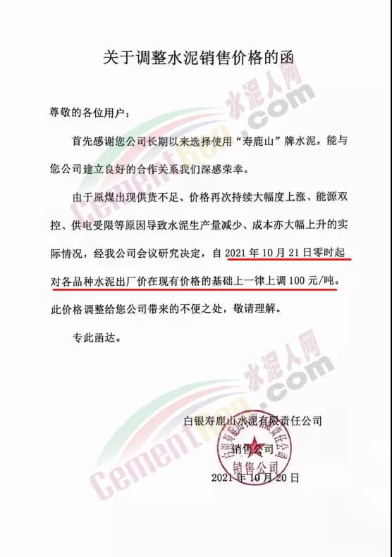 甘肅白銀壽鹿山水泥有限責任公司通知由于原煤出現供貨不足、價格再次持續大幅度上漲、能源雙控、供電受限等原因導致水泥生產量減少、成本亦大幅上升的實際情況,經公司會議研究決定,自2021年10月21日零時起對各品種水泥出廠價在現有價格的基礎上一律上調100元/噸。