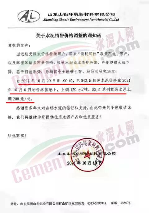 山東山鋁環境新材料有限公司通知,因近期受煤炭價格持續飆升,國家"能耗雙控"政策限電、限產以及環保等諸多因素影響,致使水泥成本急劇升高,產量規模大幅下降、鑒于目前形勢,為確保企業能夠生存,經公司研究決定,自2021年10月20日8時起,P.042.5散裝水泥價格在2021年10月6日的價格基礎上,上調150元/噸,52.5系列散裝水泥上調200元/噸。