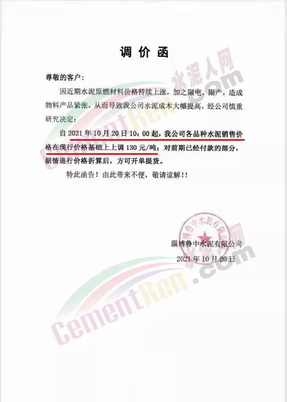 淄博錦川水泥有限公司通知,近期由于限電、錯峰生產,影響水泥原材料持續大幅上漲,根據目前水泥市場情況,經公司研究決定,自2021年10月20日10時起,各種水泥型號在原價的基礎上,上漲20元/噸。