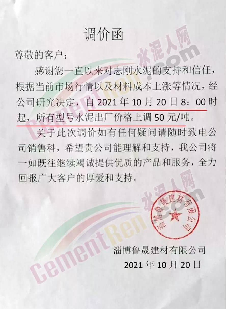 淄博魯晟建材有限公司通知,根據當前市場行情以及材料成本上漲等情況,經公司研究決定,自2021年10月20日8∶00時起,所有型號水泥出廠價格上調50元/噸。