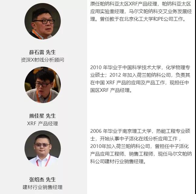 此外,本次研討會(huì)更是邀請(qǐng)到了多為行業(yè)重量級(jí)應(yīng)用專家,其中,資深 X射線分析顧問(wèn)薛石雷一先生、XRF產(chǎn)品經(jīng)理熊佳星先生、建材行業(yè)銷售經(jīng)理張紹杰先生將在線為您帶來(lái)馬爾文帕納科 XRF、XRD、CNA中子活化跨帶分析、在線粒度分析、制樣設(shè)備、智能化實(shí)驗(yàn)室等行業(yè)應(yīng)用分享,針對(duì)性的介紹水泥生產(chǎn)中每一個(gè)環(huán)節(jié)的馬爾文帕納科解決方案;并對(duì)日常儀器的使用和維護(hù)在線答疑。