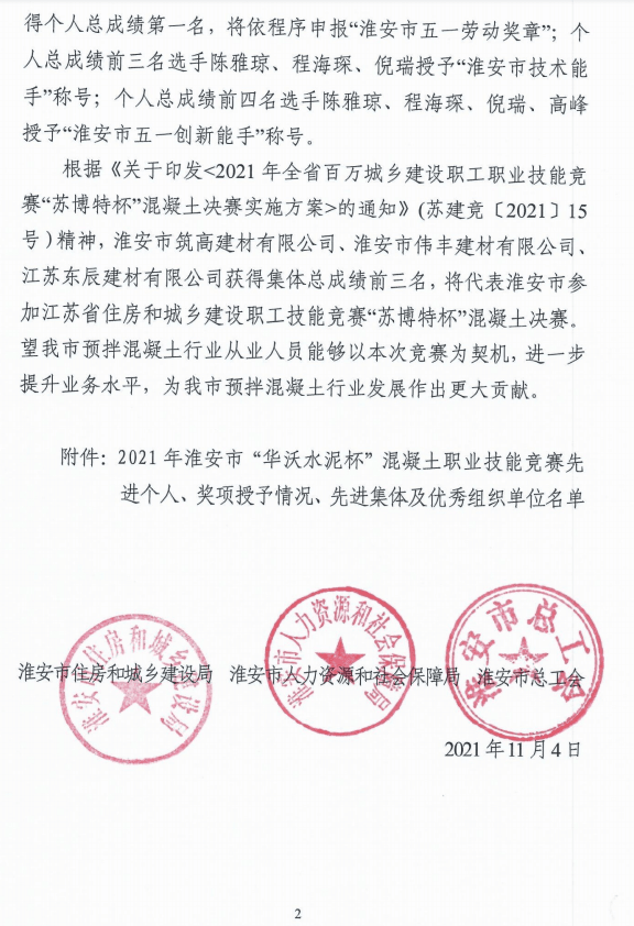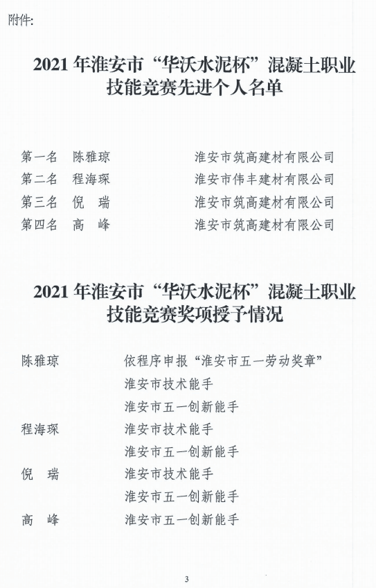 其中,來自淮安市筑高建材有限公司的陳雅瓊,取得個人總成績第一名,將依程序申報“淮安市五一勞動獎章”;個人總成績前三名選手陳雅瓊、程海琛、倪瑞授予“淮安市技術能手”稱號;個人總成績前四名選手陳雅瓊、程海琛、倪瑞、高峰授予“淮安市五一創新能手”稱號。