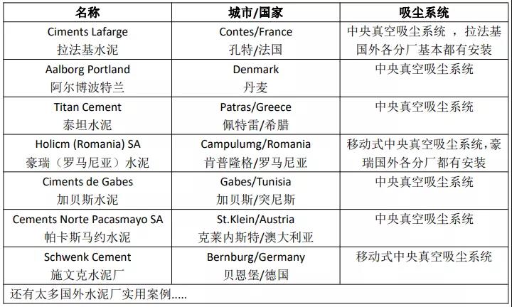 據(jù)水泥人網(wǎng)了解,在世界范圍內(nèi),目前最有效、最高效的粉塵清潔方式,采用純吸的方式(純吸無揚(yáng)塵,無二次污染),可高效快速的吸走粉塵,一次徹底清掃,杜絕二次污染,一套系統(tǒng)可抵多套普通吸塵器,可降低企業(yè)生產(chǎn)成本,提高生產(chǎn)效率,減少人力物力,實現(xiàn)清潔生產(chǎn)。該套系統(tǒng)在國外水泥廠各車間都是標(biāo)配設(shè)備,為此小編特意查閱了世界水泥工廠使用案例,真是不勝枚舉,在此先簡單羅列幾個。