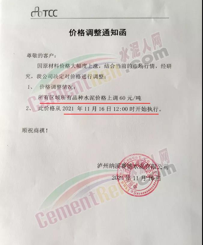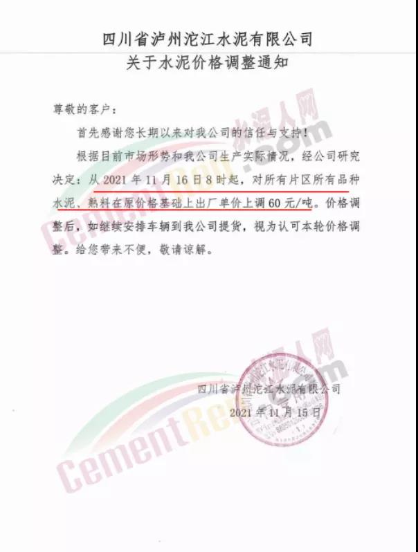 四川省瀘州沱江水泥有限公司通知根據目前市場形勢和公司生產實際情況,經公司研究決定從2021年11月16日8時起,對所有片區所有品種水泥、熟料在原價格基礎上出廠單價上調60元/噸。