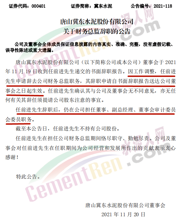 ?同日,唐山冀東水泥股份有限公司發布關于財務總監辭職的公告稱,因工作調整,任前進先生申請辭去公司財務總監職務,任前進先生辭職后,仍在公司擔任董事、副總經理、董事會審計委員會委員職務。具體公告如下: