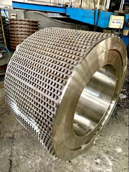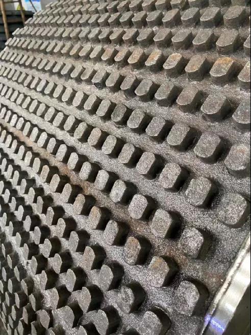 8、鑲鑄陶瓷合金棒復合輥比目前市場上使用的柱釘復合輥優勢明顯,柱釘復合輥是在輥套上鉆孔,用膠合劑粘柱釘敲入輥套中使用,但經不起原料溫度的變化,柱釘會脫落,造成擠壓輥產量和質量的降低。而鑲鑄陶瓷合金棒復合輥經過鋼水熱復合解決了合金棒的脫落現象,充分提高設備的繼續使用,降低修復成本提高產能,起到了很好的效果。