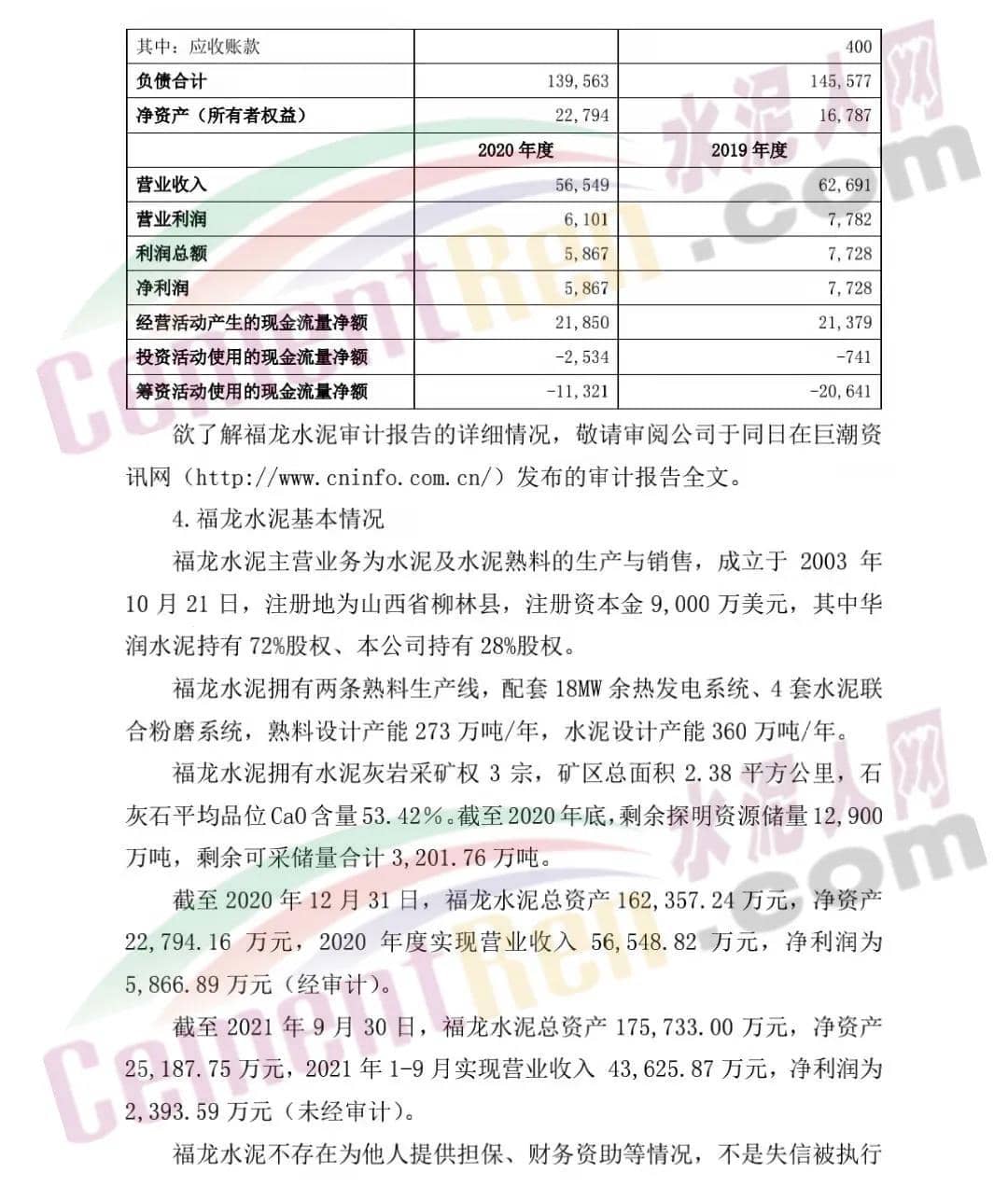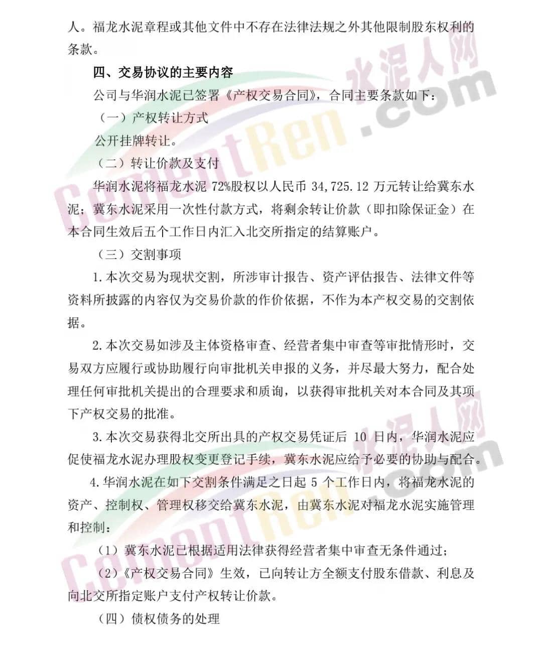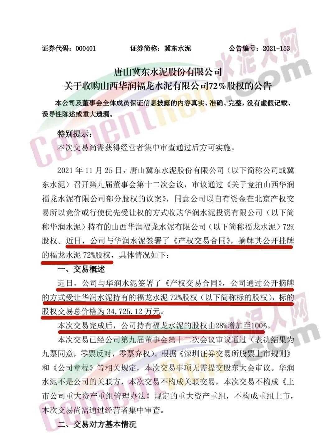 12月15日晚間,冀東水泥發布公告稱,近日,公司通過公開摘牌的方式受讓華潤水泥持有的福龍水泥72%股權,標的股權交易總價格為3.47億元。此次交易完成后,公司持有福龍水泥的股權由28%增加至100%。福龍水泥擁有完整的水泥熟料生產線,裝備和工藝水平比較先進,擁有資源品位較好的石灰石礦山,周邊輔材豐富,生產成本在區域處于領先水平。此次交易有利于公司優化山西區域的產能結構。