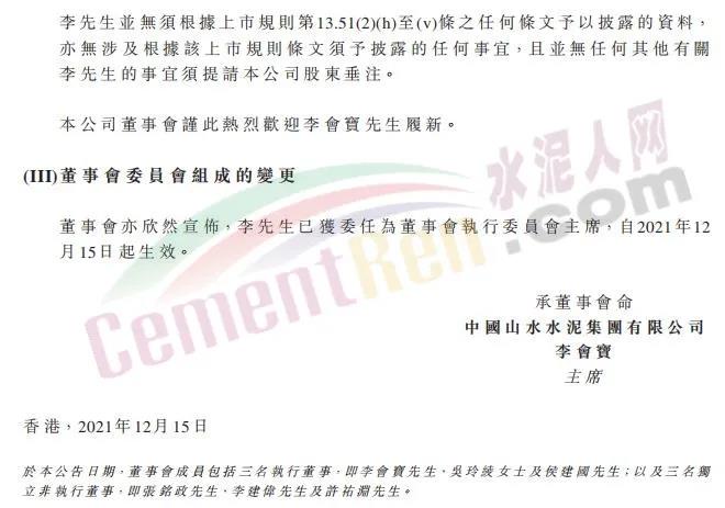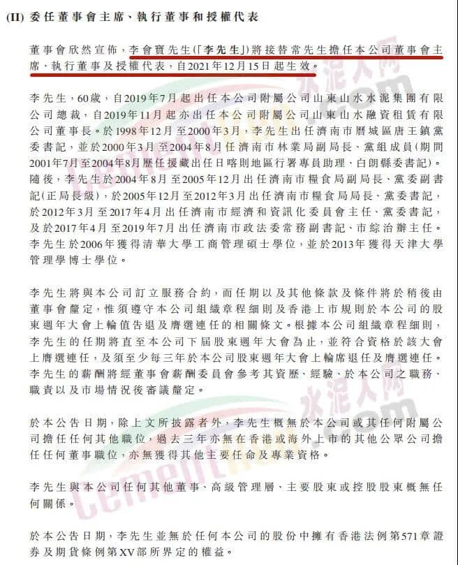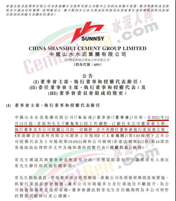 山水水泥12月16日早間在港交所公告,自2021年12月15日起,常張利因工作調整,已辭任公司董事會主席、執行董事及公司附屬公司的一切職務,亦不再擔任董事會執行委員會主席、《香港聯合交易所有限公司證券上市規則》第3.05條項下的公司授權代表及上市規則第19.05(2)條和公司條例(香港法例第622章)第16部于中國香港接收法律程序文件及通知書的授權代表職務。
