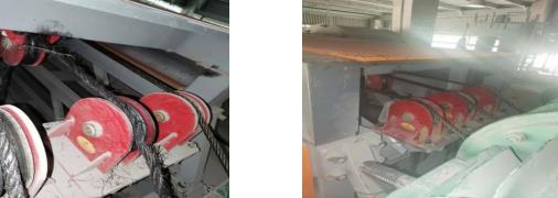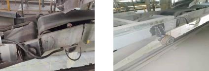 4.1對皮帶輸送機(jī)架進(jìn)行了改善:原來進(jìn)料平皮帶與出料斜皮帶兩行走輪間距過大,斜皮帶機(jī)頭部又安裝了懸掛式袋裝移動小車升降機(jī)構(gòu),在裝車過程中出現(xiàn)平、斜皮帶機(jī)滾筒聯(lián)接處斷裂故障三次。通過現(xiàn)場裝車時觀察及與智能公司的溝通,在兩皮帶聯(lián)接處增設(shè)一組行走平輪(見圖4),增加平、斜皮帶間的支撐力,避免機(jī)架聯(lián)接處開裂,造成停機(jī)故障。