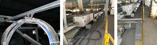 4.2對裝車機(jī)移動電源線進(jìn)行了改善:由于原來設(shè)計失誤,電源線采用吊掛移動式,在小車頻繁的移動過程中,發(fā)生掛鉤脫落故障,由于崗位人員沒有及時發(fā)現(xiàn),造成小車移動時對電源線,氣管、信號線壓斷,造成停機(jī)故障。采用托鏈?zhǔn)教娲鯍焓揭苿有≤囍麟娫矗ㄒ妶D5)。