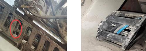 4.5 2#智能裝車機(jī)運行到6個月后,出現(xiàn)機(jī)頭內(nèi)小車放料翻板運行過程中不放料,安排維護(hù)人員進(jìn)行了排查,是電磁閥的電源線纜不通造成,更換了損壞的電源線纜,恢復(fù)正常生產(chǎn)。在隨后頻繁出現(xiàn)類似故障,更換在線線纜后恢復(fù)正常,一周后又出現(xiàn)翻板打不開故障。通過對故障的分析,在線電纜不適合頻繁移動,造成故障停機(jī),將原RVV型號的信號線纜更換為TRVV信號線纜,徹底解決了這一故障(見圖8)。