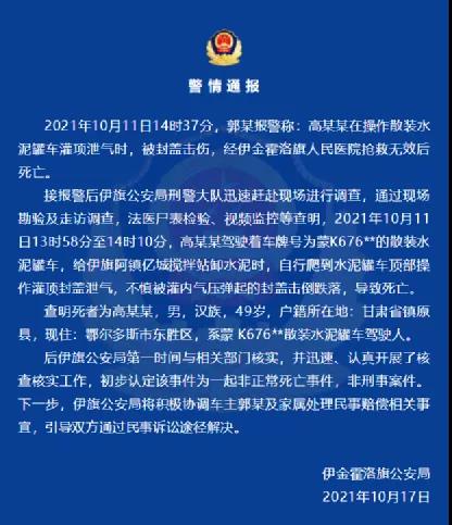 此前,就有公安局發布警情通報稱,位于內蒙古自治區鄂爾多斯市伊旗的散裝水泥罐車駕駛人高某某在操作罐項泄氣時,被封蓋擊傷,經醫院搶救無效后死亡。