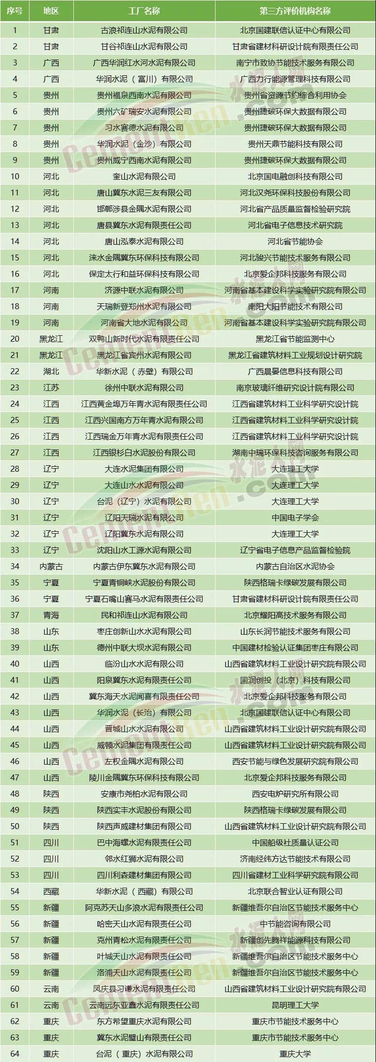 日前,工信部發布2021年度綠色制造名單,其中綠色工廠包括海螺、天山、中聯、南方、西南、北方、祁連山、金隅冀東、華潤、華新、天瑞、山水、臺泥、堯柏、聲威、東方希望等64家水泥企業,綠色供應鏈管理企業包括河北鼎星水泥有限公司、廣靈金隅水泥有限公司、陽泉冀東水泥有限責任公司等3家水泥企業。詳情如下: 綠色工廠名單(水泥企業) 2021年度綠色供應鏈管理企業名單 (水泥企業)