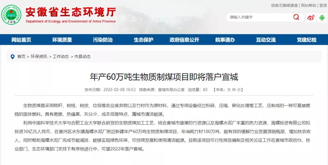 安徽省生態環境廳消息:年產60萬噸生物質制煤項目即將落戶宣城。其中提到,海螺投資有限公司擬投資30億元人民幣,在宣州區海螺水泥廠附近新建年產60萬噸生物質制煤項目,該項目可望2022年落戶宣城。