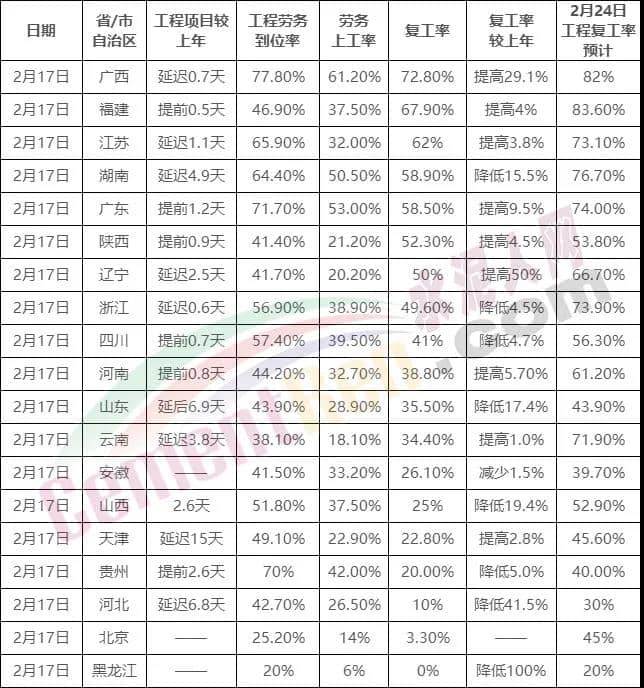 工程方面,以上19個省市自治區中福建、廣東、陜西 、四川、河南、貴州等6個省較上年同期有所提前,其中貴州省提前了2.6天。黑龍江、河北、貴州、山東、山西、四川、浙江、湖南等省復工率較上年均有降低,黑龍江工程復工率為0,工程勞動到位率僅為20%。預計本月24日前后,上述19個省市自治工程復工率最高可達80%。