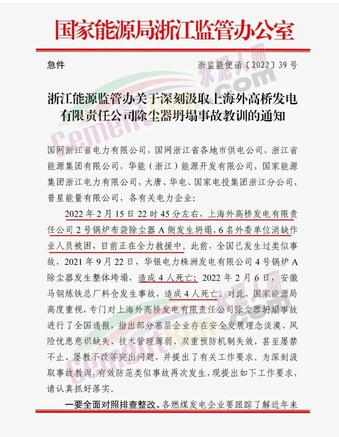 2月17日,國家能源局浙江工監(jiān)管辦公室發(fā)布急件《浙江能源監(jiān)管辦關(guān)于深刻汲取上海外高橋發(fā)電有限責(zé)任公司除塵器坍塌事故教訓(xùn)的通知》稱,2022年2月15日22時45分左右,上海外高橋發(fā)電有限責(zé)任公司2號鍋爐布袋除塵器A側(cè)發(fā)生坍塌,6名外委單位消缺作業(yè)人員被困。