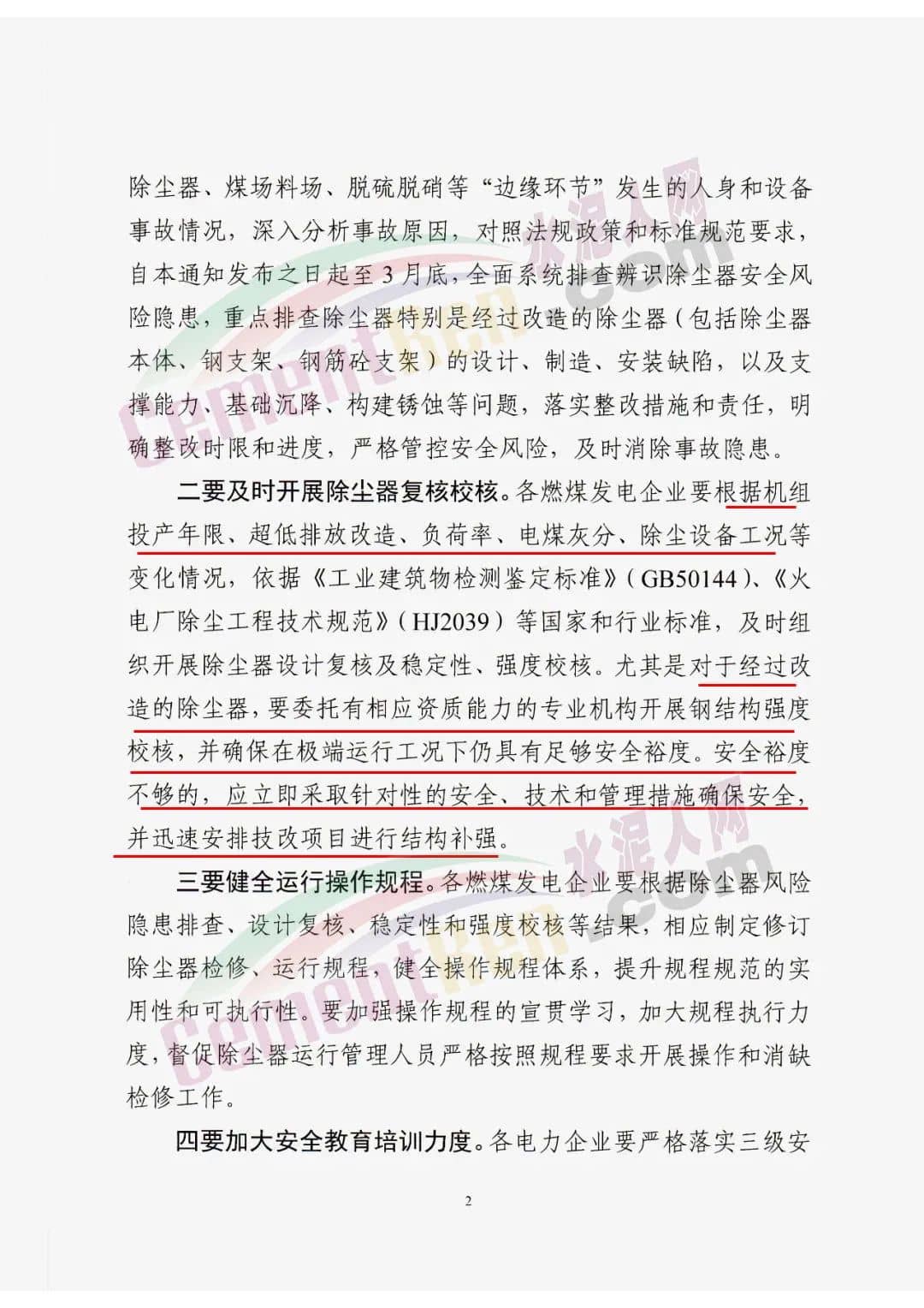各燃煤發(fā)電企業(yè)要跟蹤了解近年來除塵器、煤場料場、脫硫脫硝等"邊緣環(huán)節(jié)"發(fā)生的人身和設(shè)備事故情況,深入分析事故原因,對照法規(guī)政策和標(biāo)準(zhǔn)規(guī)范要求,自本通知發(fā)布之日起至3月底,全面系統(tǒng)排查辨識除塵器安全風(fēng)險隱患,重點排查除塵器特別是經(jīng)過改造的除塵器(包括除塵器本體、鋼支架、鋼筋砼支架)的設(shè)計、制造、安裝缺陷,以及支撐能力、基礎(chǔ)沉降、構(gòu)建銹蝕等問題,落實整改措施和責(zé)任,明確整改時限和進度,嚴(yán)格管控安全風(fēng)險,及時消除事故隱患。