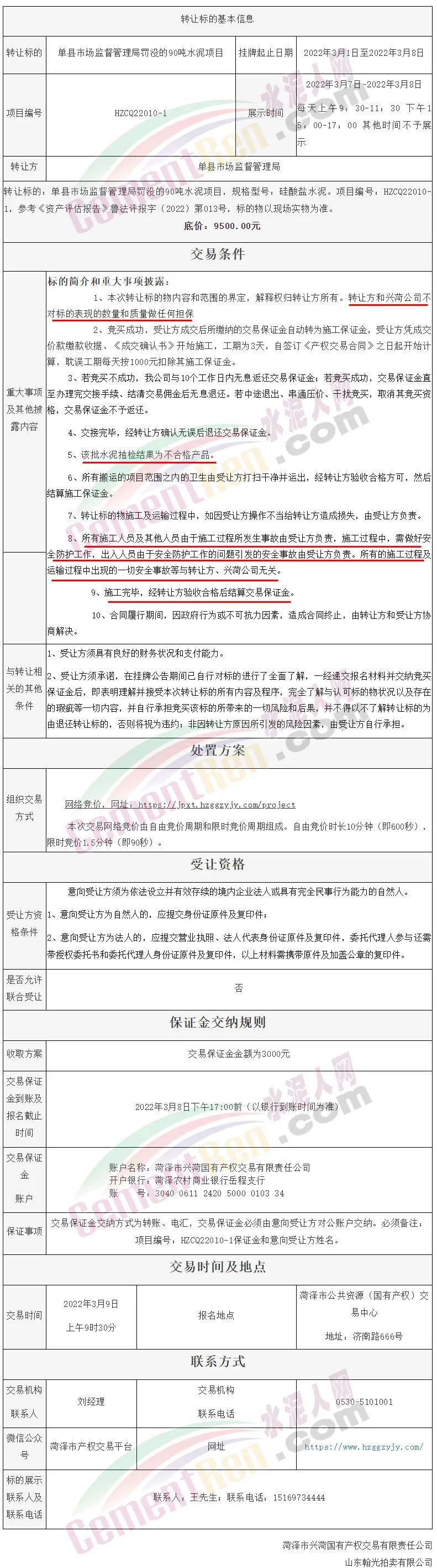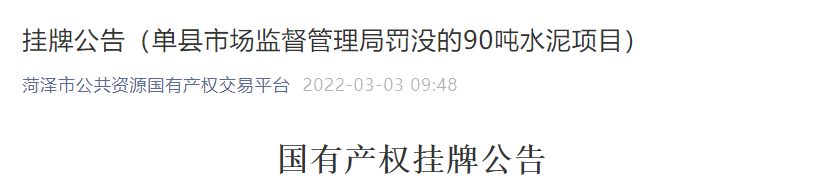 ?日前菏澤市公共資源國有產(chǎn)權(quán)交易平臺發(fā)布的一則《國有產(chǎn)權(quán)掛牌公告》的顯示,將于2022年3月1日至2022年3月8日掛牌轉(zhuǎn)讓標(biāo)的為單縣市場監(jiān)督管理局罰沒的90噸硅酸鹽水泥,底價(jià)為9500元 。重大事項(xiàng)及其他披露內(nèi)容中明確“該批水泥抽檢結(jié)果為不合格產(chǎn)品。”