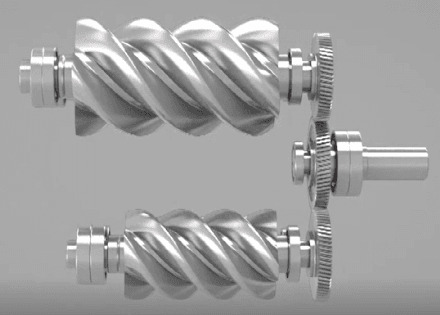 1. 主機采用高效雙級壓縮,由主齒輪帶動兩個同步齒輪,驅動兩個壓縮主機。均分及降低了壓縮比,減少泄漏量,提高容積效率。