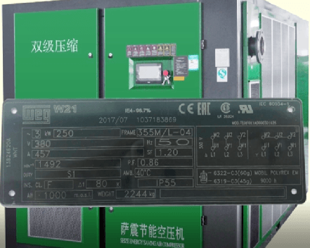 6. 采用進口品牌的低壓差納米空濾,玻纖油濾及折疊式油分降低內部壓損,提升效率。電機采用全球三大品牌之一WEG品牌,IE4一級能效等級,IP55防護等級B級溫升,獨立風冷,確保高效節能,高可靠。
