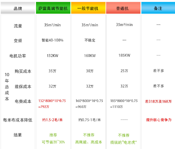 空壓機使用10年產生的費用對比表