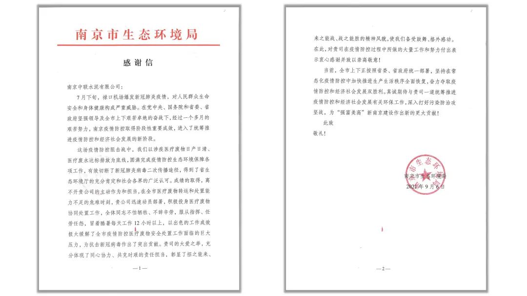 “貴司的大愛之舉,充分體現了同心協力、共克時艱的責任擔當,彰顯了招之能來、來之能戰、戰之能勝的精神風貌,使我們備受鼓舞、格外感動。在此,對貴司在疫情防控過程中所做的大量工作和努力付出表示衷心感謝并致以崇高敬意!”這是南京市生態環境局于2021年9月6日給予南京中聯水泥有限公司的一封感謝信。