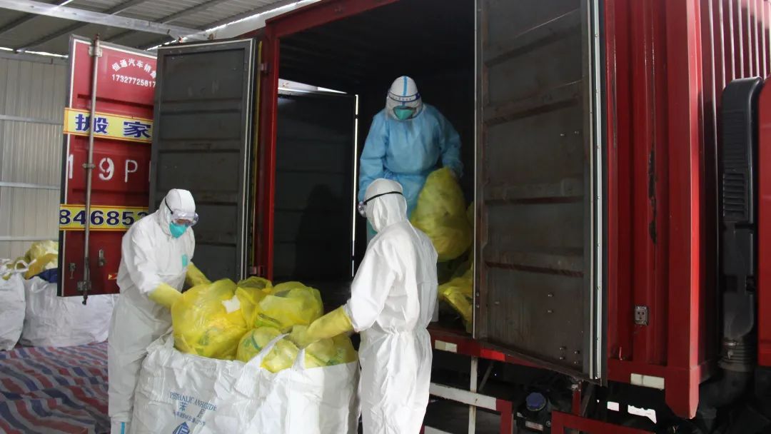“危廢物來的量很大,一車接一車,有用于核酸檢測的試劑盒、棉簽、廢棄的口罩、防護服等醫療廢物,還有大量的隔離區餐食垃圾。”