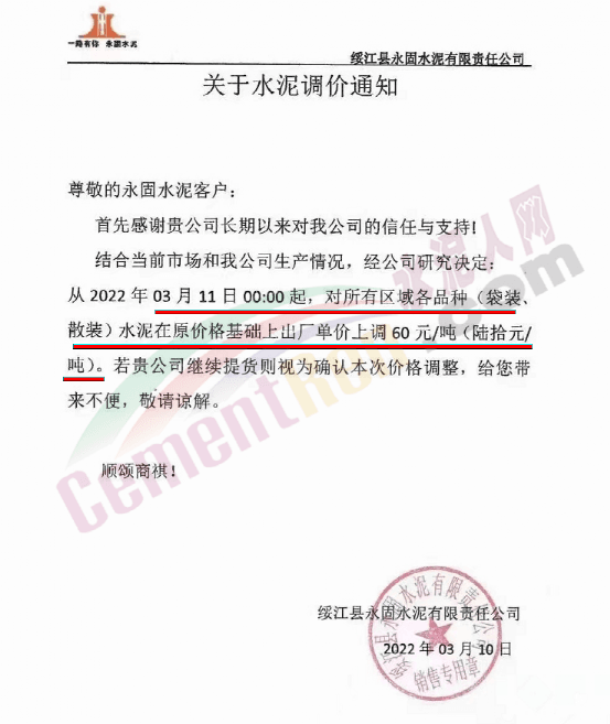 梅州市塔牌營銷有限公司通知,依照《水泥購銷合同》的約定,經福建塔牌水泥有限公司授權通知及我公司研究決定,自2022年3月14日零時起,福建、梅州基地各廠所有散裝水泥出廠結算價格分別在現行價格基礎上上調70元/噸,所有熟料、袋裝水泥出廠結算價格分別在現行價格基礎上上調50元/噸。