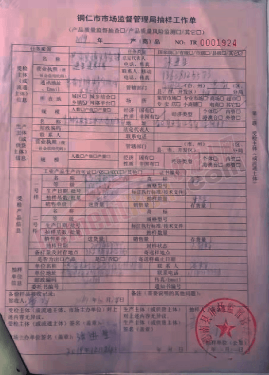 圖:銅仁市市場監管管理局抽樣工作單