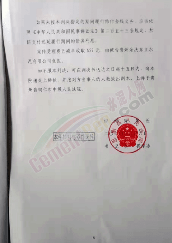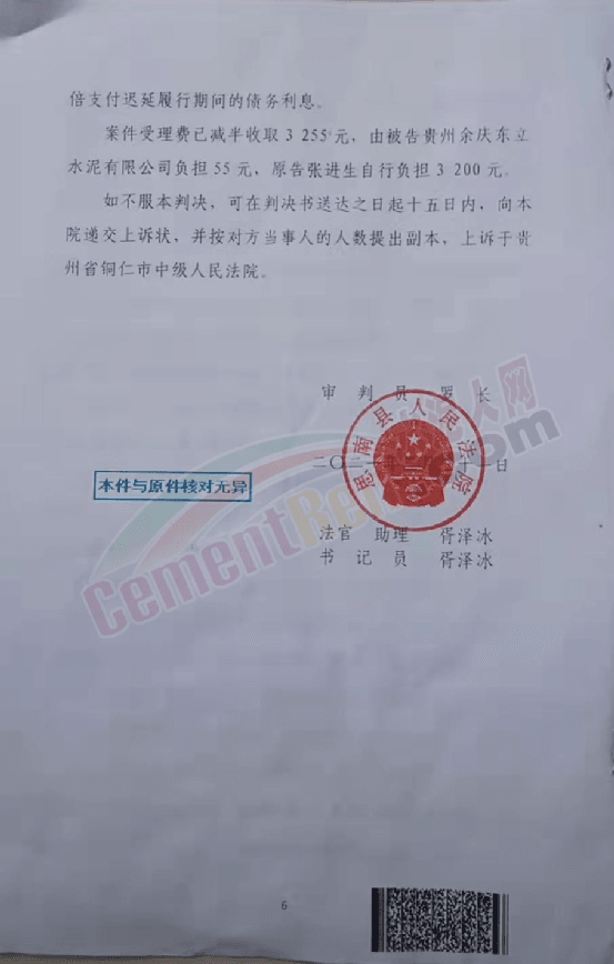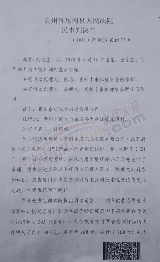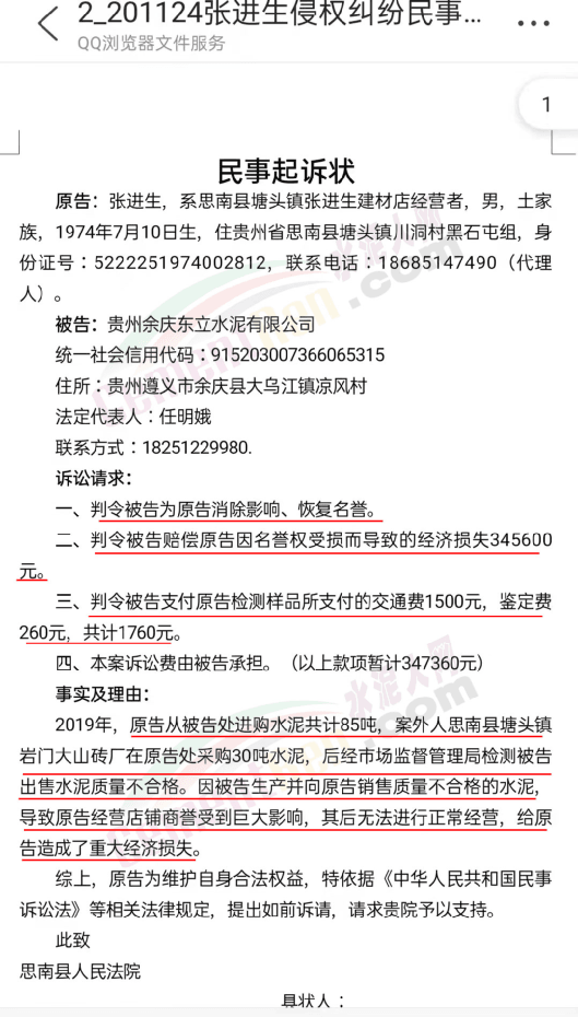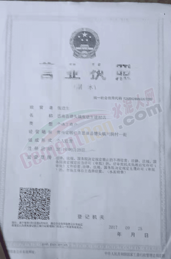 日前,水泥人網接到貴州省銅仁市思南縣塘頭鎮川硐村黑石屯組建材經銷個體戶張進生反饋稱,因銷售不合格水泥被客戶訴之法院,導致名譽受損,水泥銷售生意難以維系。