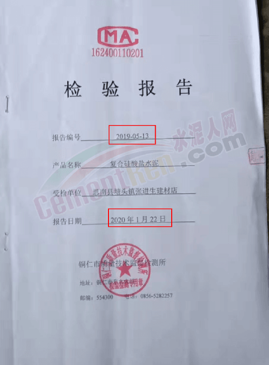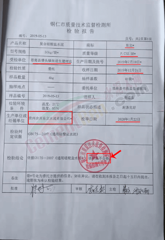 依據張進生提供銅仁市質量技術監督檢測所2019-05-13檢驗報告顯示,自思南縣塘頭鎮張進生建材店抽樣的一個批次東立牌P.C32.5R復合硅酸鹽水泥不合格。產品生產經單位為貴州余慶東立水泥有限公司。生產日期及批號為2019年7月10日,收樣日期為2019年12月24日 ,檢畢日期為2020年1月22日。