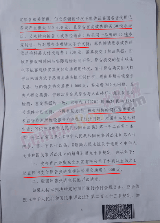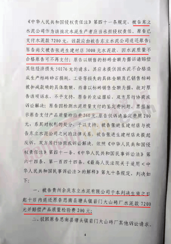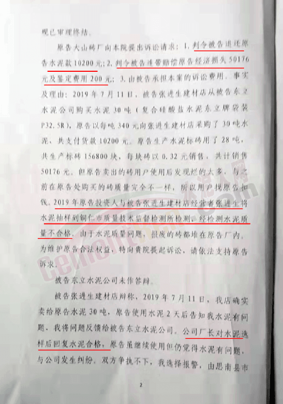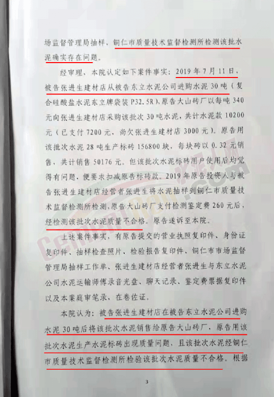 法院判決書提到,被告張進生建材店在被告東立水泥公司進購水泥30噸后將該批次水泥銷售給原告大山磚廠,原告用該批次水泥生產水泥標磚出現質量問題,且該批次水泥經銅仁市質量技術監督檢測所檢驗該批次水泥質量不合格。