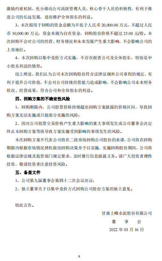 3月15日晚間上峰水泥公告,基于對公司未來發展前景的信心以及對公司價值的認可,擬以自有資金2~3億元回購公司股份用于實施員工持股計劃或股權激勵計劃。這也是公司結合財務狀況、經營情況以及未來盈利能力和發展前景等因素,為維護廣大投資者利益,增強投資者信心而采取的務實舉措。
