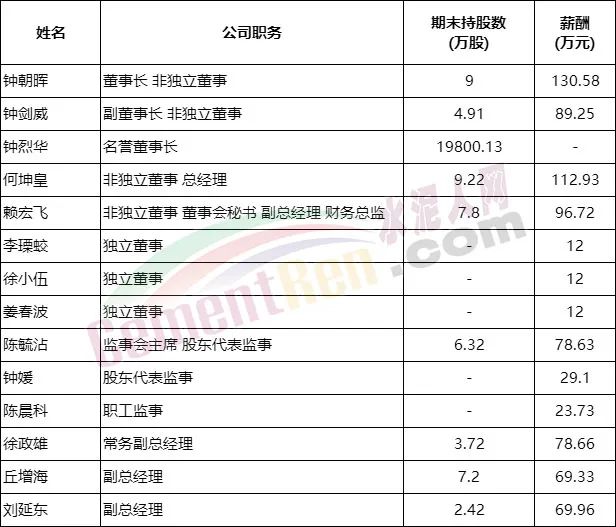 上市公司數據庫數據顯示,董事長鐘鐘朝暉年薪酬130.58萬元,副董事長鐘劍威年薪為89.25萬元,總經理何坤皇年薪112.93萬元,董事會秘書賴宏飛年薪96.72萬元,年薪過百萬高管共2人。