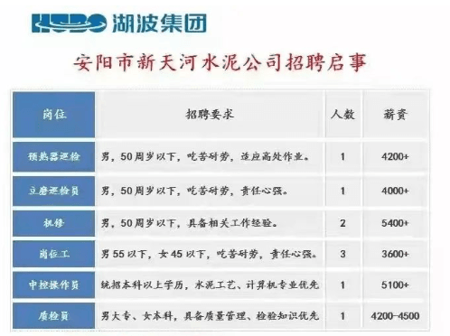 河南湖波集團安陽市新天河水泥招聘預熱器巡檢、立磨巡檢、機修工、崗位工、中控員、質檢員等,薪資在4000-5400元/月。