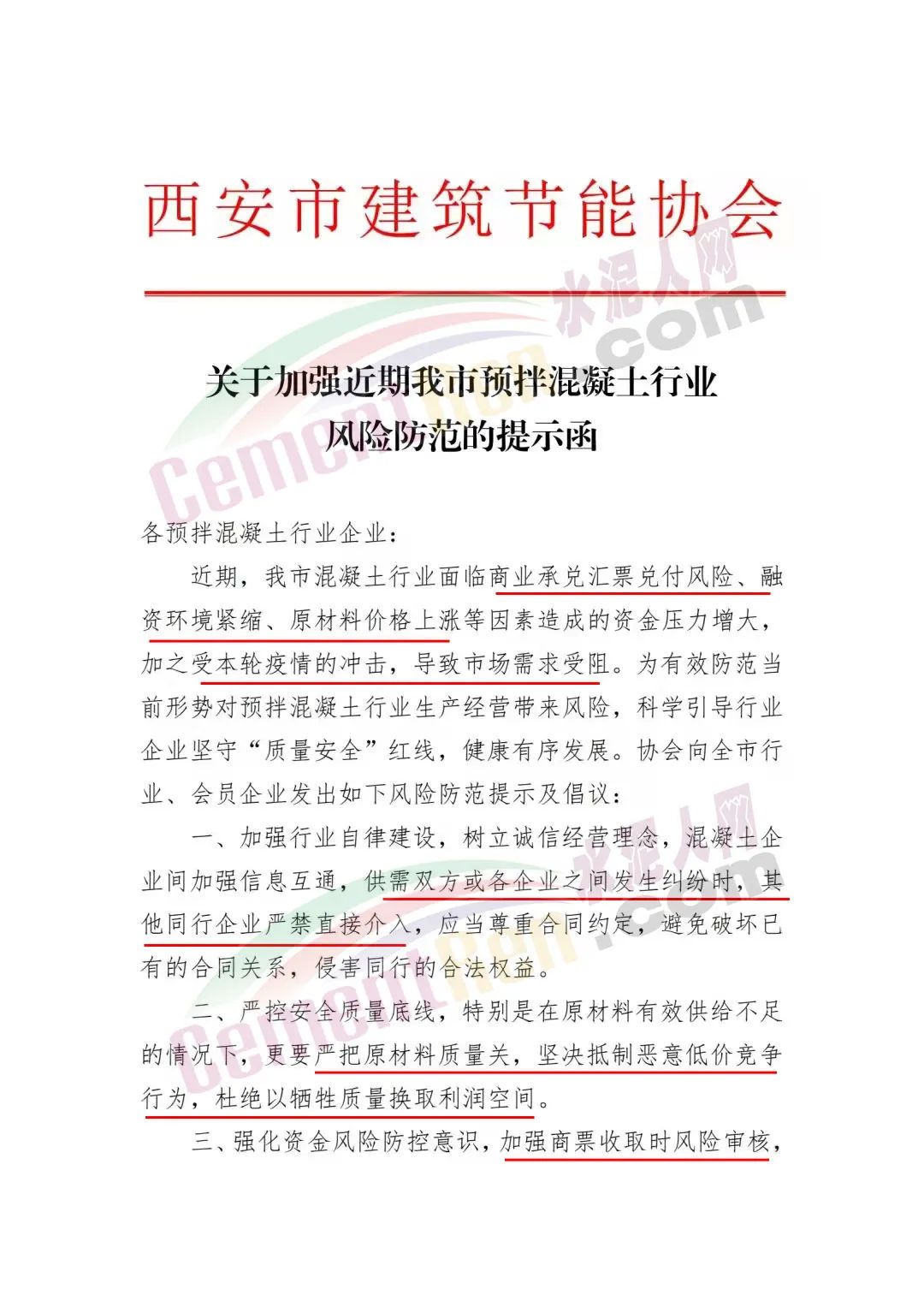 日前,西安市建筑節能協會發文稱,近期,西安市混凝土行業面臨商業承兌匯票兌付風險、融資環境緊縮、原材料價格上漲等因素造成的資金壓力增大,加之受本輪疫情的沖擊,導致市場需求受阻。協會特發布風險防范提示及倡議: