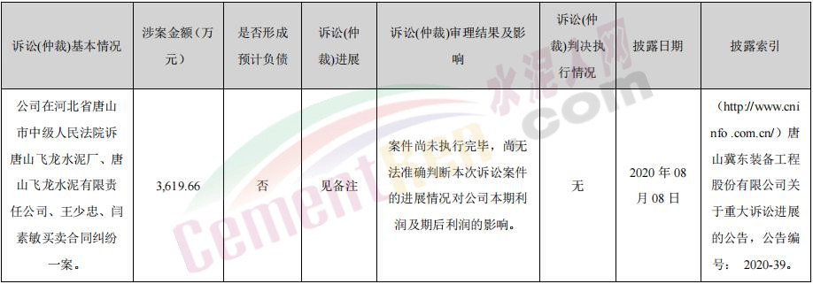 3月17日,冀東裝備發(fā)布2021年年度報(bào)告,披露了一則重大訴訟、仲裁事項(xiàng),該事項(xiàng)涉及與唐山飛龍水泥廠的合同糾紛,具體如下: